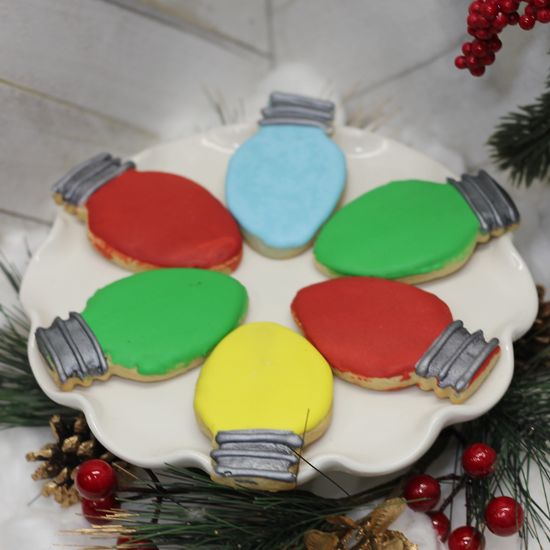 6 pack Christmas Light Bulb Cookies decorated in all Colors and Painted with edible silver to hand out at Christmas by Goodies Bakeshop