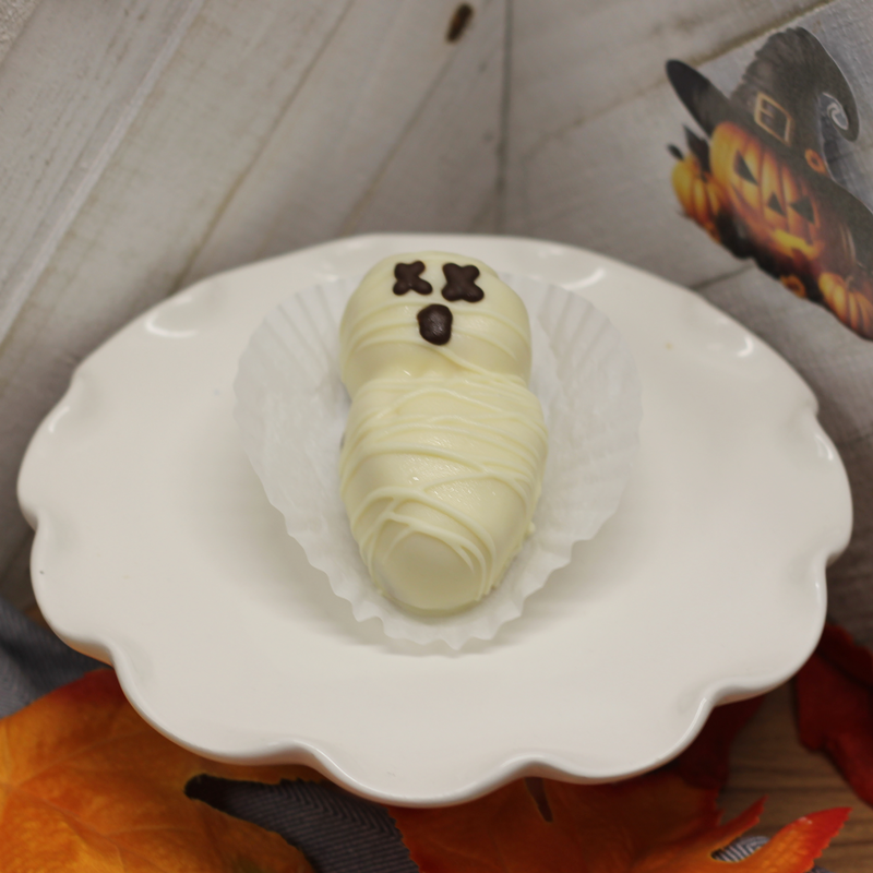 White chocolate truffle cake, lemon raspberry mousse filling, dipped in white chocolate and finished as a mummy for Halloween
