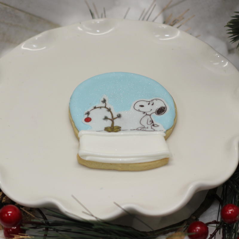 Snow globe sugar cookies with various Christmas scenes and graphics