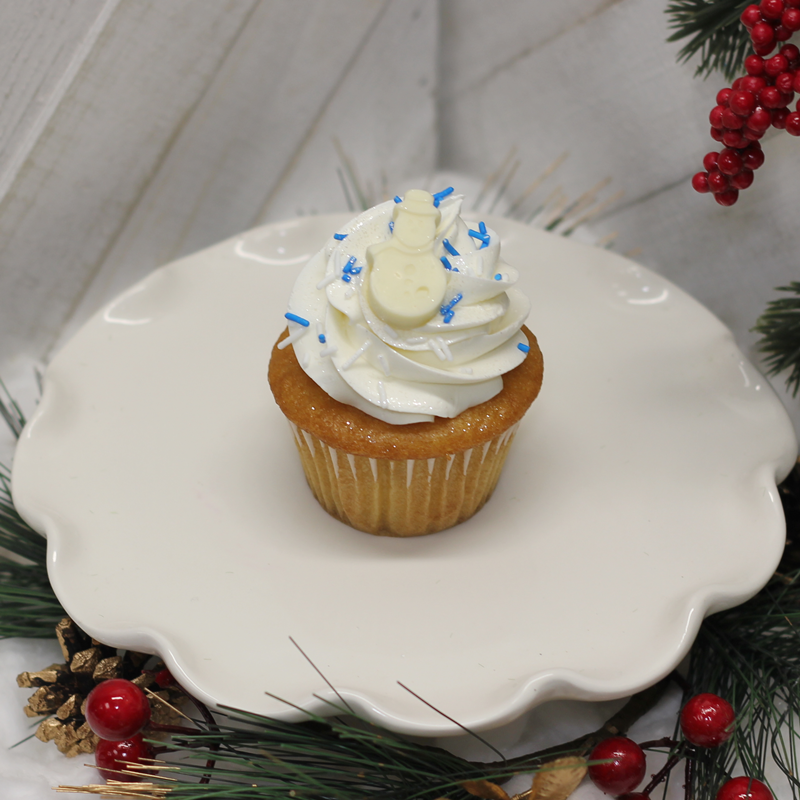 Vanilla Velvet Cupcake with Buttercream icing topped with a chocolate Christmas deco and Winter Sprinkles for Christmas at Goodies Bakeshop